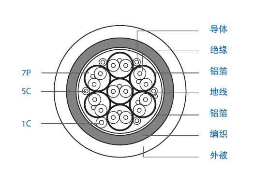 导体:28 AWG 镀锡铜线0.38   半成品:7P+6C+地线, 一起成缆