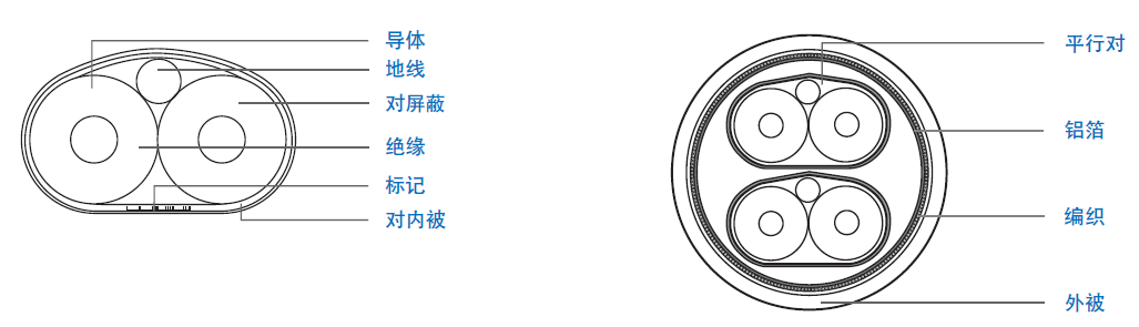 | 地线:24 AWG 单根镀锡铜线, 外径0.515 mm | 外屏蔽:38 AWG 镀锡导体,重叠率 80% |