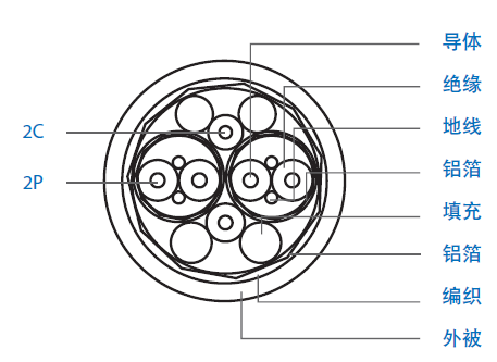 | 导体:25 AWG 镀锡铜线7*0.18 | 半成品:2P+2C+填充, 一起成缆 |