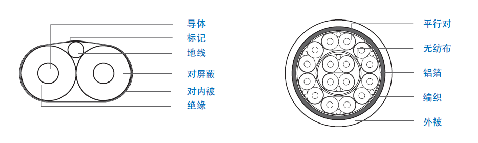 地线:28 AWG 单极镀锡铜线, 外径0.33 mm   外屏蔽:36 AWG 镀锡导体,重叠率 80%