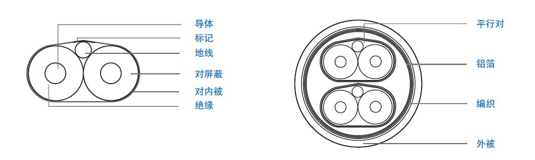 导体:28 AWG 单根镀银铜线, 外径0.35 mm   外屏蔽:38 AWG 镀锡导体,重叠率 80%